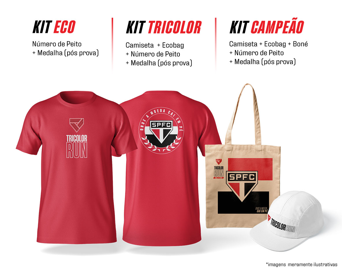 Os Kits da Tricolor Run 2026 te convidam a viver uma experiencia nova. O Kit básico é composto por camiseta, número de peito e medalha, já o kit premium vêm recheado com produtos limitados que você só conseguirá adquirir se inscrevendo na prova e vivendo essa experiência única.